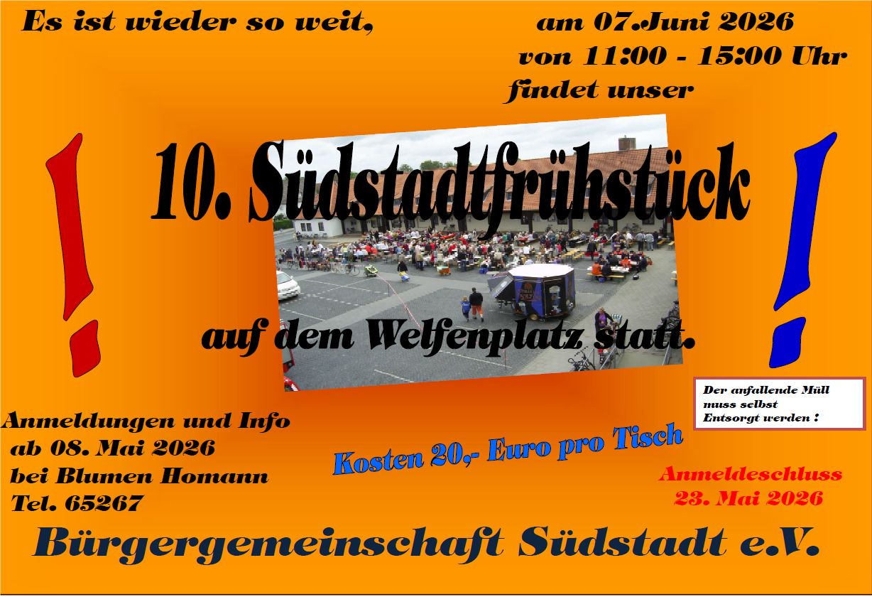 Vielleicht sind Sie gerade neu in die Südstadt gezogen und haben durch Zufall von uns erfahren? Oder Sie wohnen hier schon eine Weile und haben noch nie bei uns vorbeigeschaut? So oder so – die Bürgergemeinschaft Südstadt heißt Sie herzlich willkommen! Unsere Veranstaltungstermine und regelmäßigen Treffen finden Sie hier auf unserer Webseite im Veranstaltungskalender. Bei Fragen nehmen Sie doch einfach Kontakt mit uns auf!
