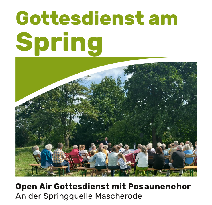 Herzliche Einladung zum Gottesdienst am Spring, open air und mit Blasmusik, am 22. Juni 11 Uhr. Die Springquelle befindet sich am Ortsausgang Mascherode Richtung Stöckheim.
